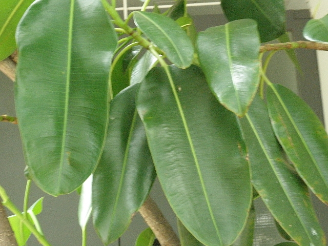 <問題9>クワ科イチジク属の常緑高木。葉は厚い革質で、楕円形または長楕円形、表面には光沢があり、互生する。18世紀までは、この樹木から天然ゴムの原料を採取していたが、今は主に観賞用に植栽される。 |