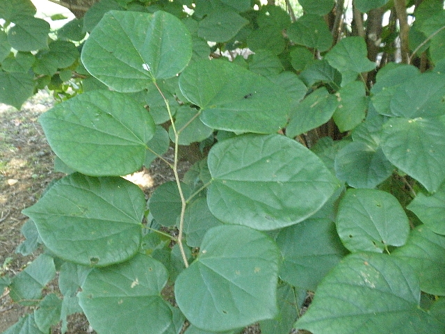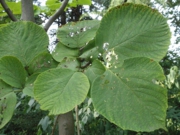 <問題4>樹皮は皮目が目立ち灰色ないしは暗灰色。葉には5-12cmの葉柄があり、葉身は8-15cmの三角状心形あるいは広卵形。葉に独特の臭気があり、触るとくさい。花期は8-9月で枝先に集散花序を頂生し淡桃白色の花をつける。 |
